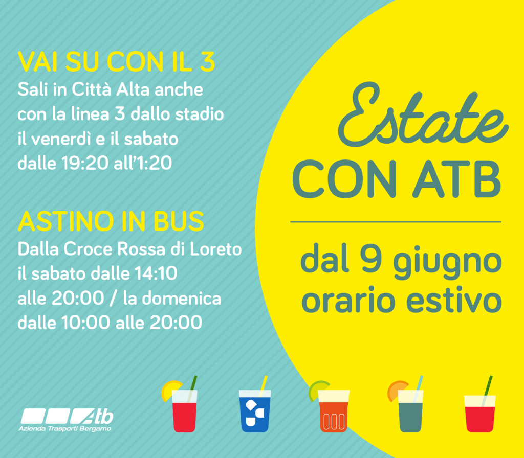 Bergamo, 1 GIU – ATB e TEB comunicano che da giovedì 9 giugno entra in vigore l’orario estivo 2016. ATB Dall’1 al 26 agosto da lunedì a venerdì le corse ATB viaggiano seguendo l’orario del sabato. Fanno eccezione le linee 1 – 3 e le funicolari che dopo le ore 20:30 seguono il regolare […]