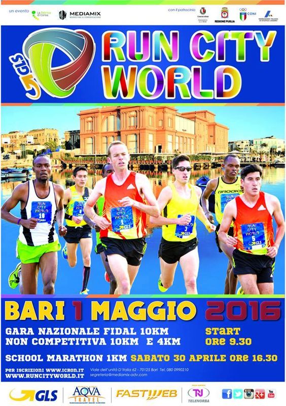 Bari, 28 APR – Domenica 1° maggio a Bari si corre la “Run City World”, la maratona patrocinata dal Comune di Bari e sponsorizzata dalla holding internazionale GLS che unisce gli amanti della corsa, della corretta alimentazione e della solidarietà. “Run City World”, con partenza (ore 9.30) e arrivo in piazza Diaz, si divide in […]