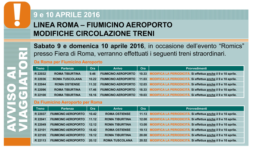 Roma, 8 APR – Più treni sabato 9 e domenica 10 aprile per raggiungere La Fiera di Roma in occasione delle giornate conclusive di ROMICS, il Festival del Fumetto.